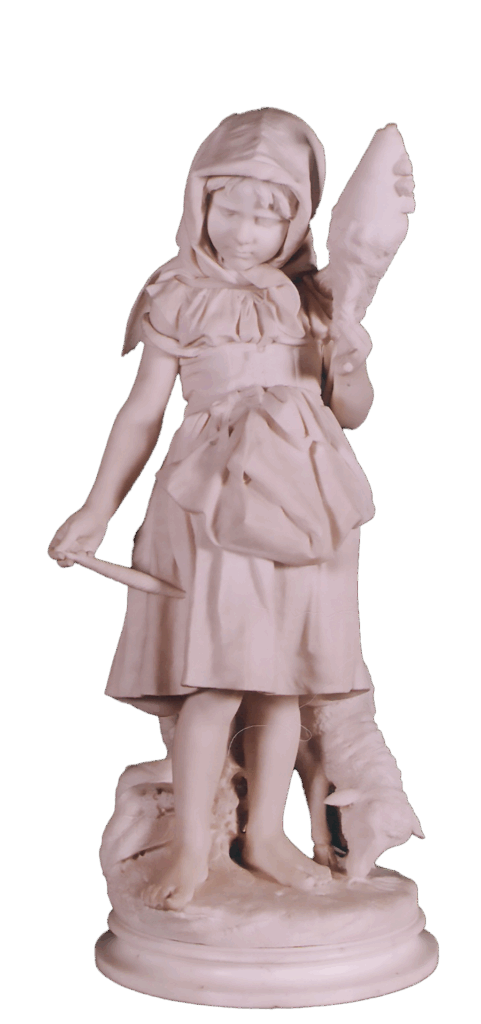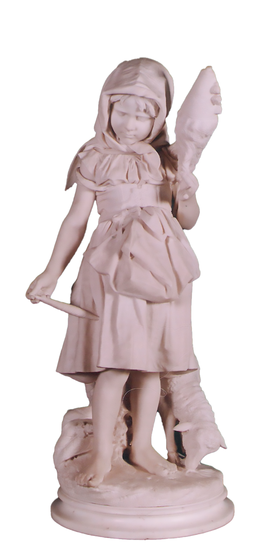 DESCRIPCIÓN:Escultura que representa a una pastora niña vestida a la usanza campesina, posee los elementos de hilar en cada mano y está acompañada de una oveja, todo sobre una base del mismo material.