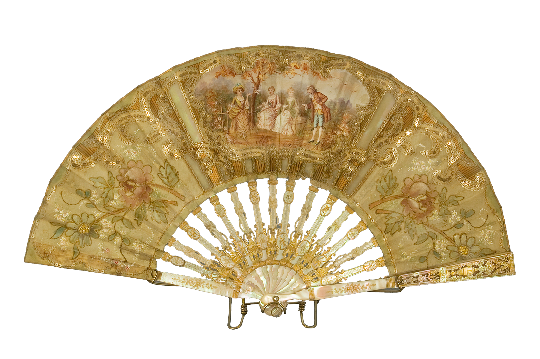Anverso: bordado y pintado, lentejuelas en la escena familiar, decorado con alegorías musicales, garrones, motivos florales y escena familiar en reserva central.